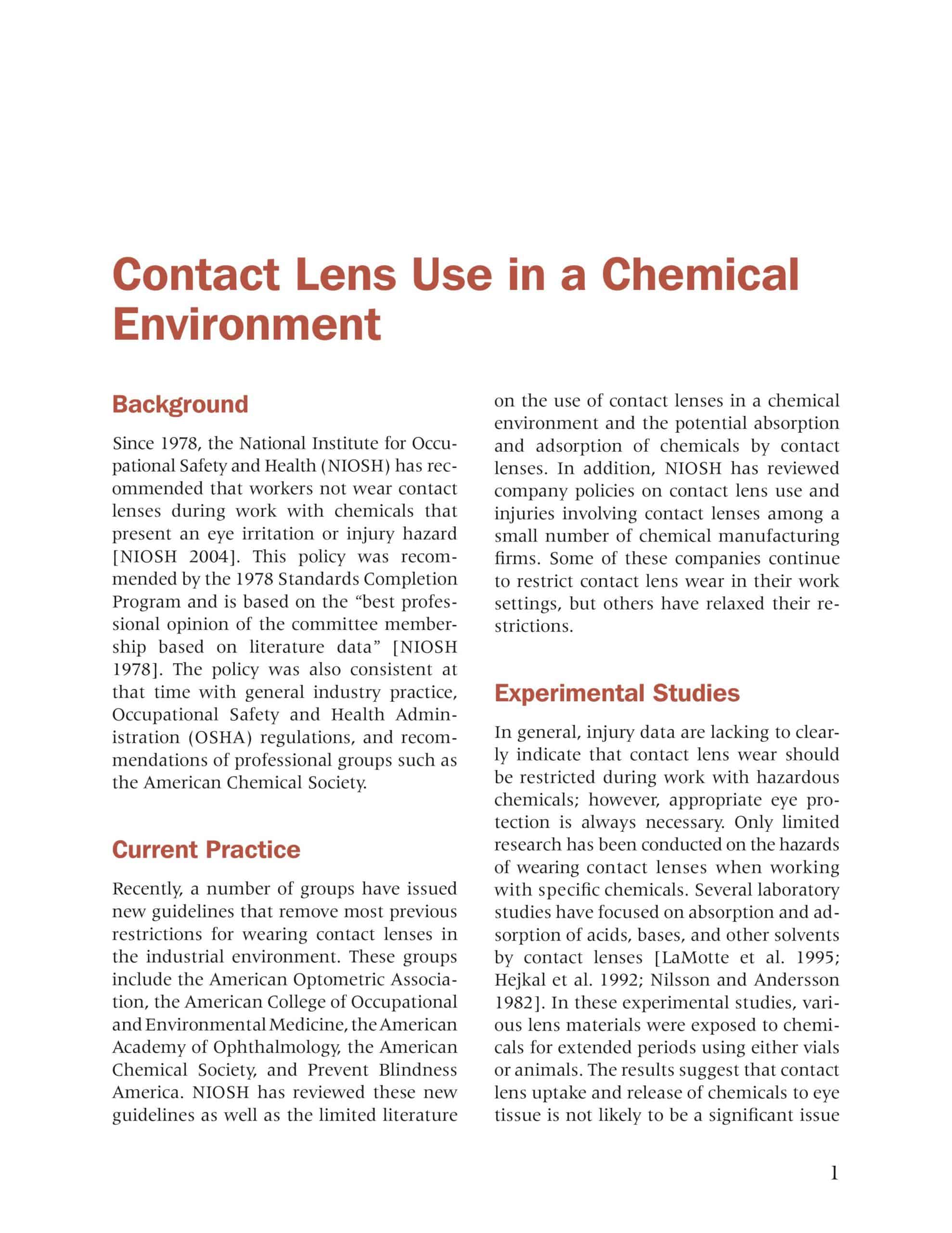 NIOSH has reviewed these new guidelines as well as the limited literature on the use of contact lenses in a chemical environment and the potential absorption and adsorption of chemicals by contact lenses.