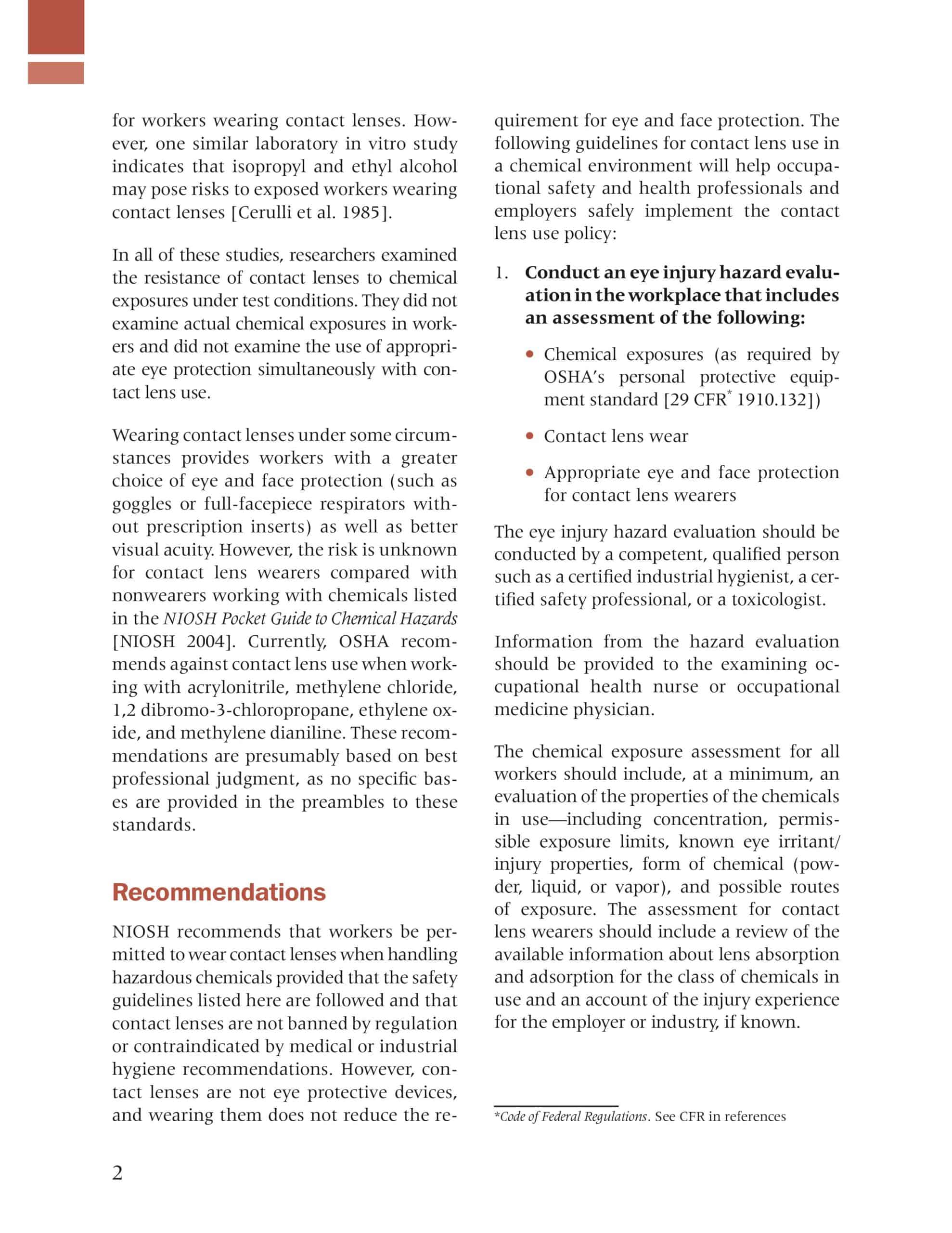 Since 1978, the National Institute for Occupational Safety and Health (NIOSH) has recommended that workers not wear contact lenses during work with chemicals that present an eye irritation or injury hazard [NIOSH 2004].