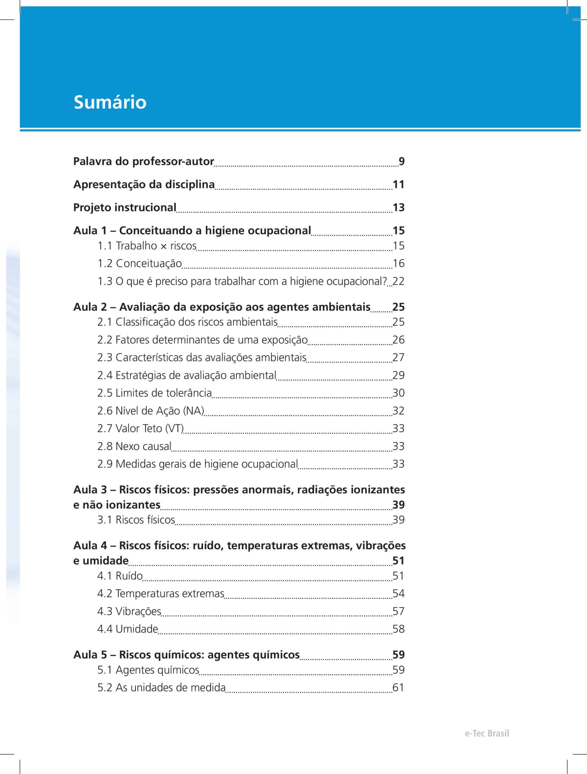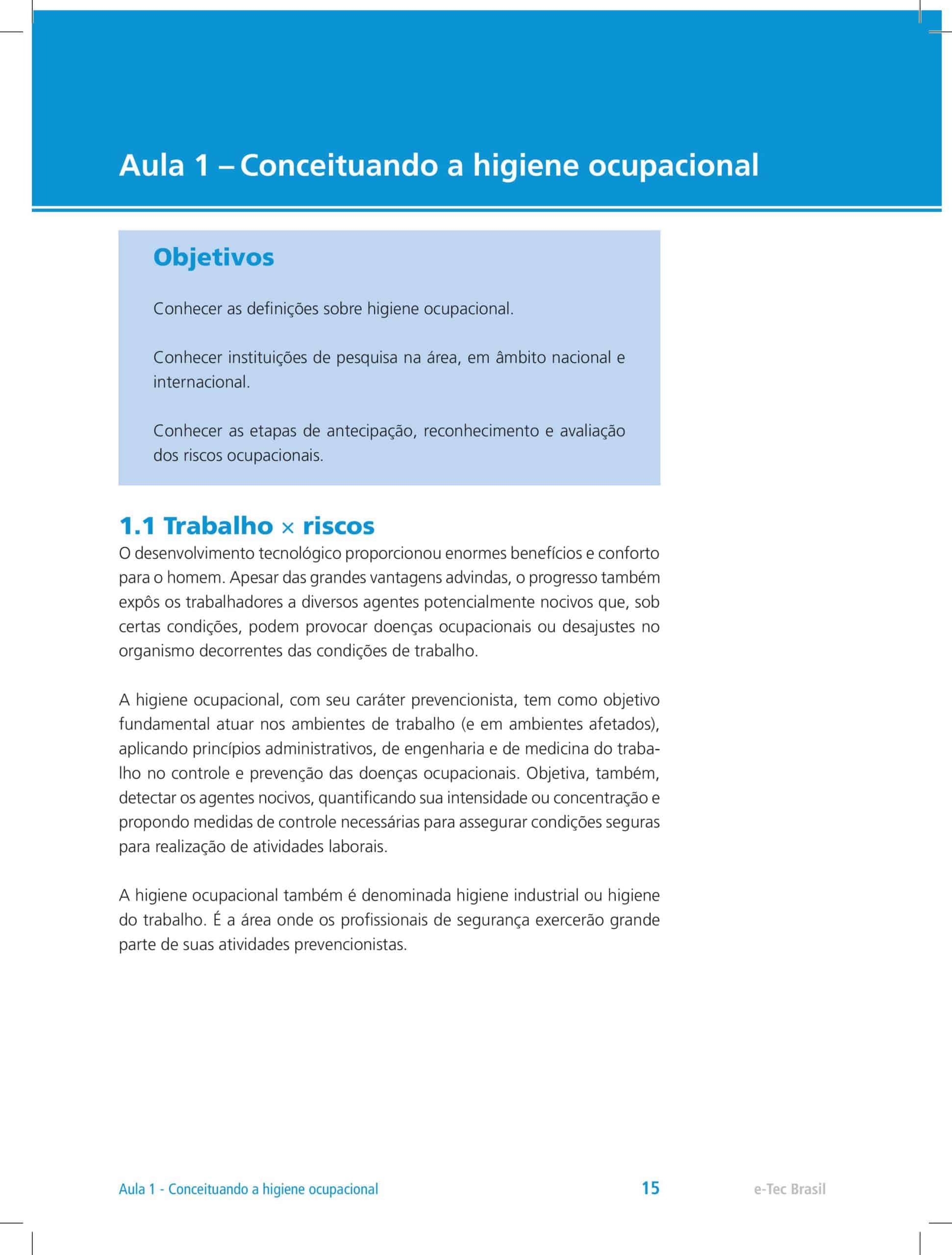 A disciplina de Higiene Ocupacional I tem como objetivo apresentar ao aluno os riscos que podem estar presentes em um ambiente ocupacional, analisando os aspectos técnicos envolvidos, introduzindo a legislação e algumas definições básicas para o desenvolvimento da disciplina.