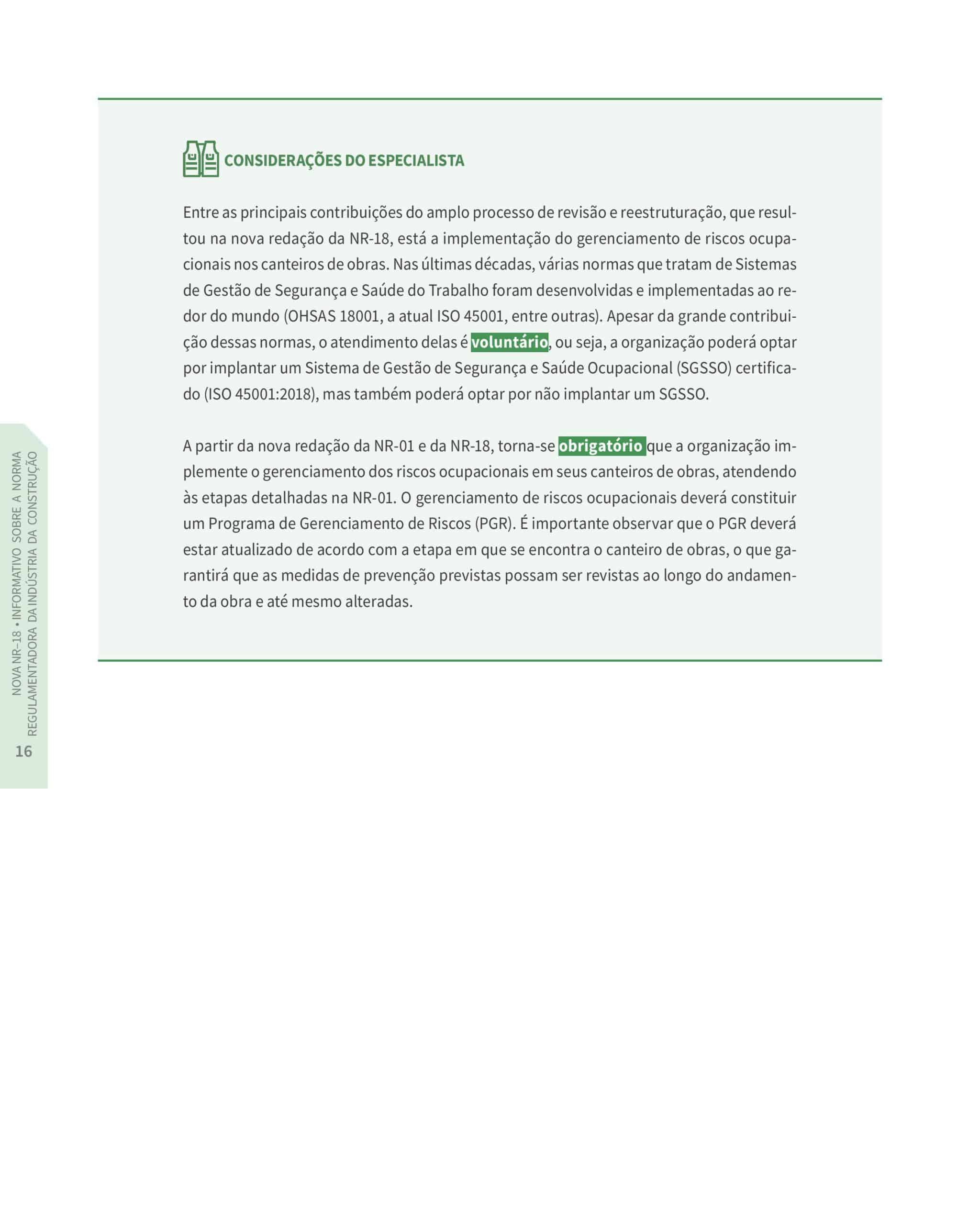 O novo texto dessa NR, intitulado “Condições de Segurança e Saúde no Trabalho na Indústria da Construção”, tem previsão de entrada em vigor no dia 1º de agosto de 2021. No entanto, é importante observar as disposições transitórias apresentadas no art. 3º da Portaria nº 3.733, de 10 de fevereiro de 2020 (supracitada), que estabelecem prazos maiores para que alguns dispositivos específicos desse texto normativo passem a ser exigidos.