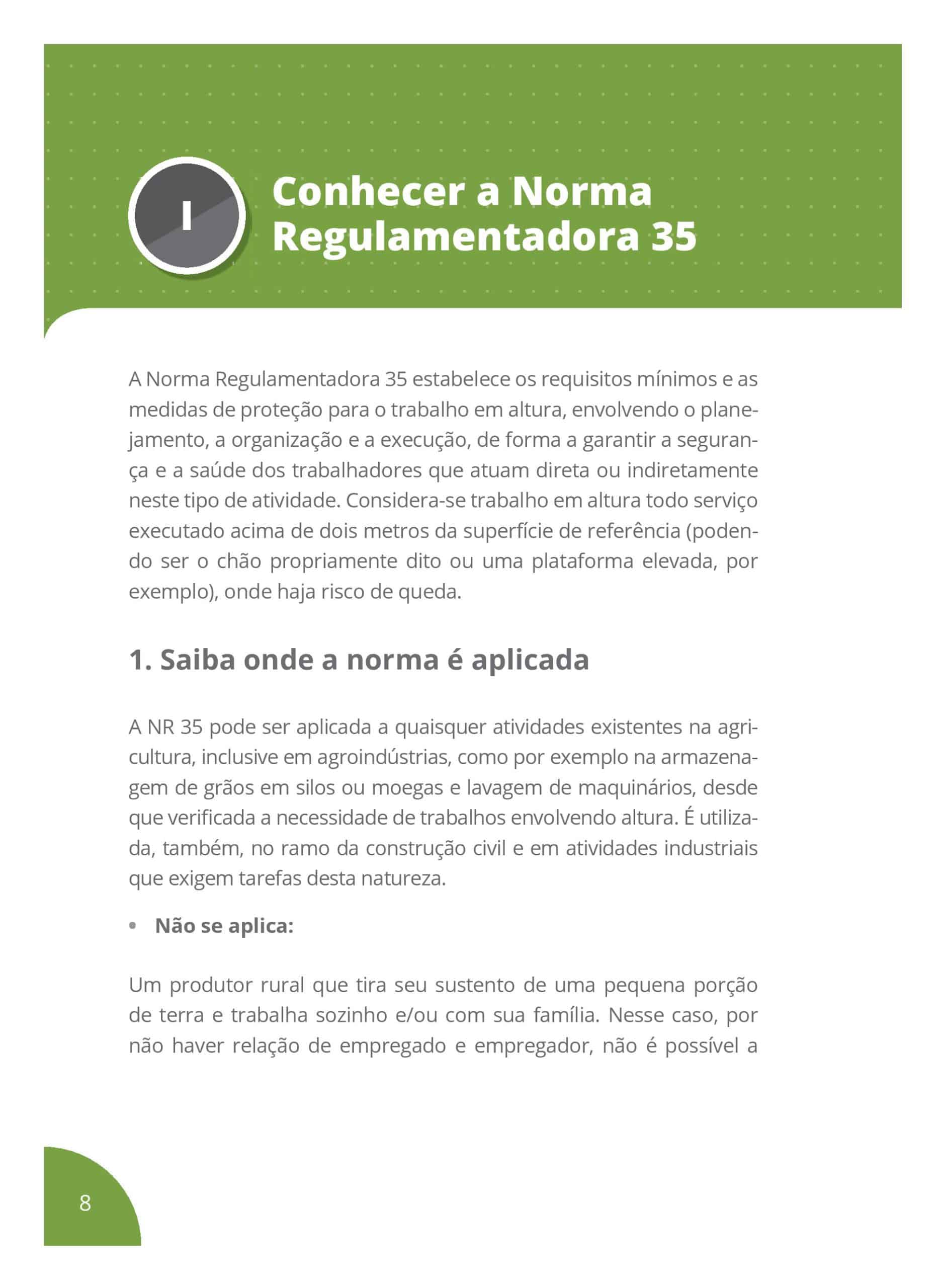 Esta cartilha apresenta os processos mais importantes referentes à Norma Regulamentadora (NR) 35, que se aplica no meio rural, dependendo da atividade que o produtor desempenha.