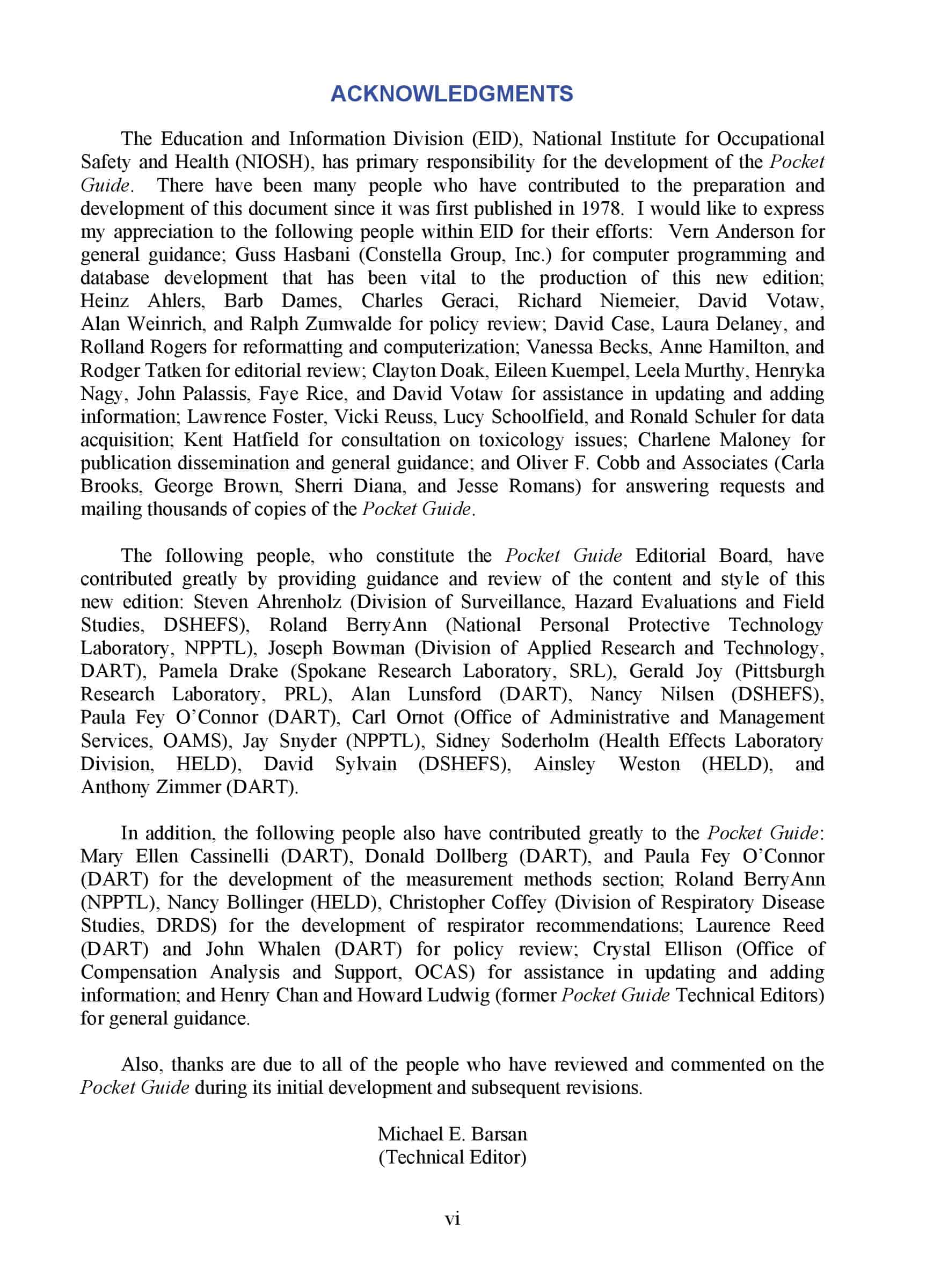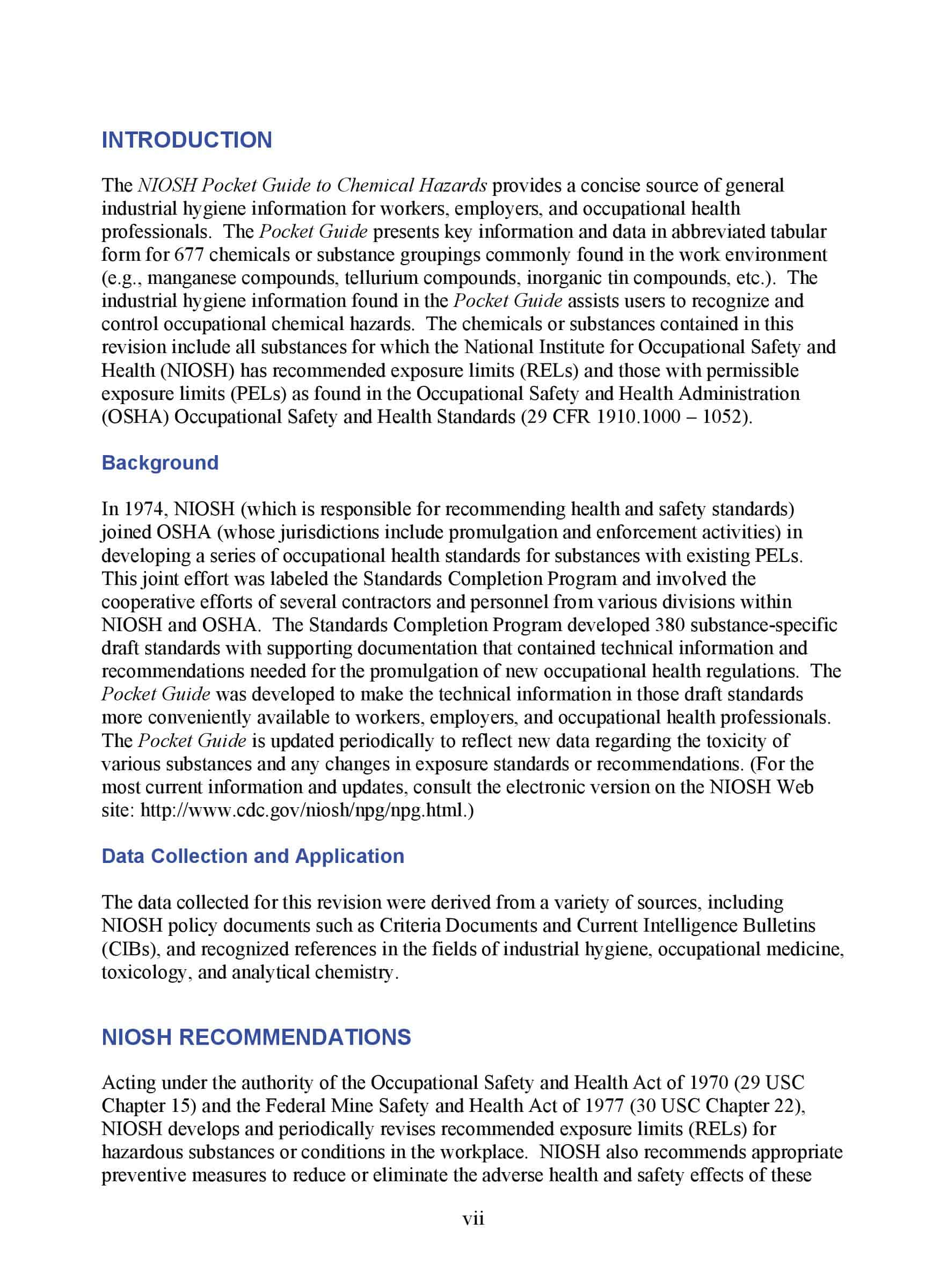 The information assembled in the original 1978 printing of the Pocket Guide was the result of the Standards Completion Program, a joint effort by NIOSH and the Department of Labor to develop supplemental requirements for the approximately 380 workplace environmental exposure standards adopted by the Occupational Safety and Health Administration (OSHA) in 1971.